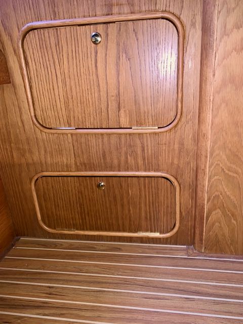 Cambria was designed with a small third cabin–a guest bedroom. It’s very small–too small for guests really. We use it as a storage area. Most of the space is occupied by our freezer. Under the cabin floor is a fair bit of useable storage space but because of the freezer we can’t access it. Sharlene has worked with David to create side access doors to the space. David is a very good carpenter so he was able to cut out the access and reuse the wood to make secure doors into the space.