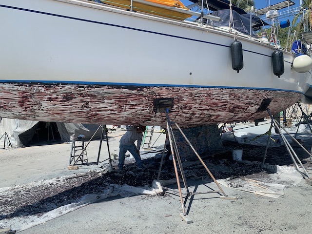 What wasn’t routine was that we hired a company to do the bulk of the work. Last time we did all the sanding, scraping and painting ourselves. This time we let someone else do it. Actually, we had them strip and sand off all the old layers of bottom paint so we were right down to the gel coat. From there, they primed the hull and added fresh bottom paint.