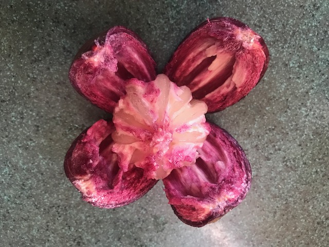 Caimito, or star apple, has a purple skin and segments like a Christmas orange. It reminds me of a cross between a mangosteen and a lychee but slimier.